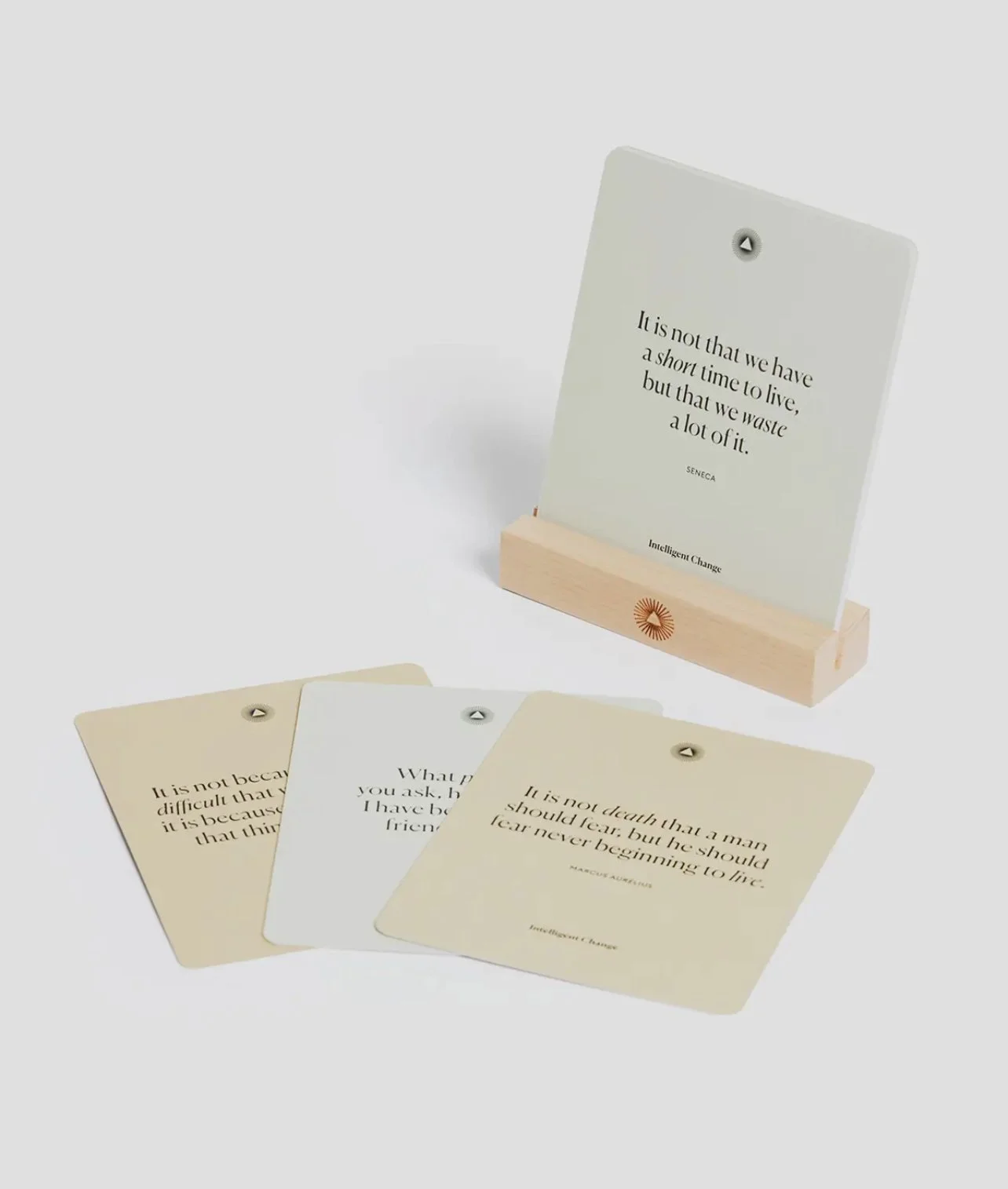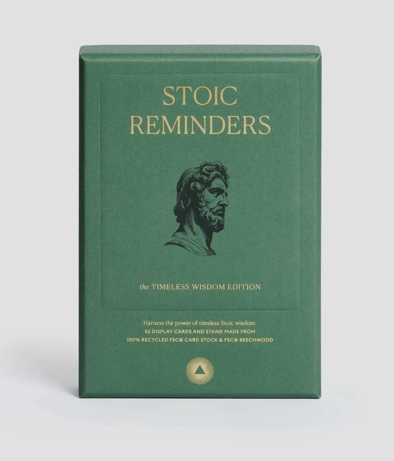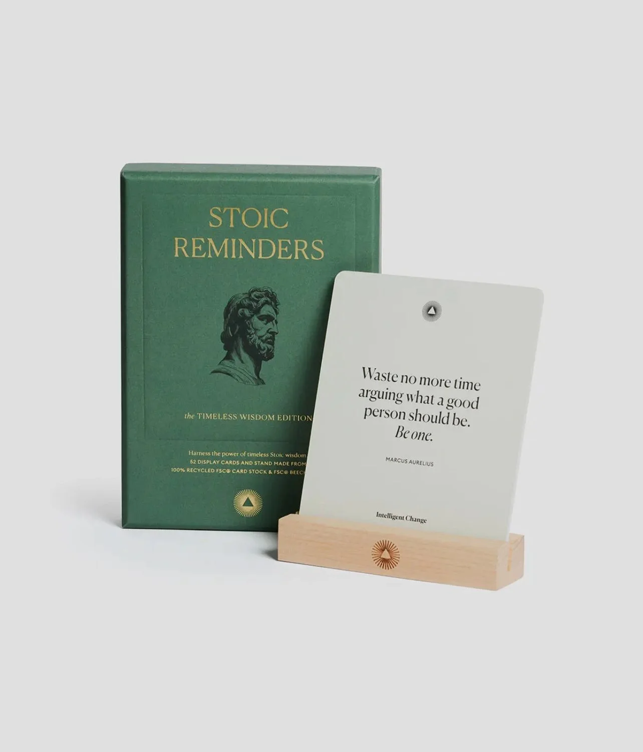 The Stoics, ancient philosophers like Marcus Aurelius and Seneca, were pioneers of practical wisdom. Their message? Life's true richness comes from inner peace, self-control, and living in harmony with nature. Stoic Reminders brings their transformative philosophy into your daily routine with inspiring quote cards. Display one on your desk or by your bed, and let their honest words bring you back to what's important-your peace, your balance, your strength. Beechwood stand included.